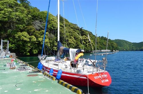 2014.5.23(金) 志摩ヨットハーバー→九木浦桟橋30.1マイル 6時10分志摩ヨットハーバーを出る 12時に九木浦桟橋に接岸、舫いを固めて終って12時40分。 九木浦は私の愛する所です。 神秘的です。 両側を岩の山に囲まれた細い水路を入って行き、 さらに右奥へ…