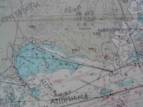 2018.7.1(日) 味野港に来るとき、泥に埋まり、動かなくなったので、 出て行き方も問題があるに違いないとUW1のハーバーマスターに確認 味野港への来方: 写真の一番目、海図に見る様にコースを設定。 昨年、なんの問題もなく味野港に行きつけたのは上げ潮…