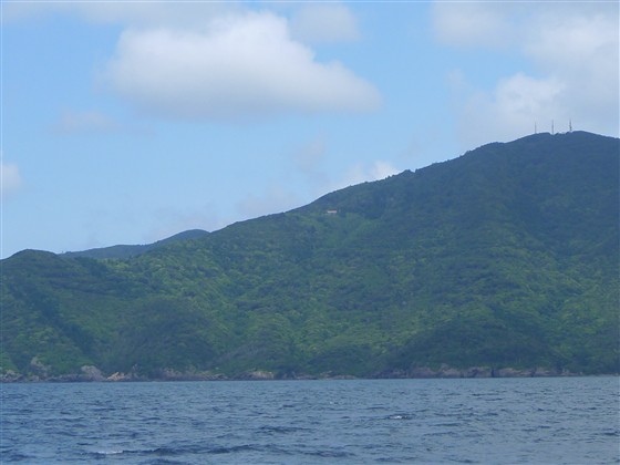 ・海から焼火神社を探す。中腹に建物らしきものが見える。社務所ではないでしょうか。